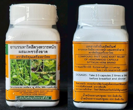 ประกาศสำนักงานคณะกรรมการอาหารและยา เรื่อง ผลการตรวจสอบผลิตภัณฑ์สมุนไพร (ยาบรรเทาริดสีดวงทวารหนัก ผสมเพชรฆาต ตราสิทธิคุณเครื่องยาไทย G 266/65)